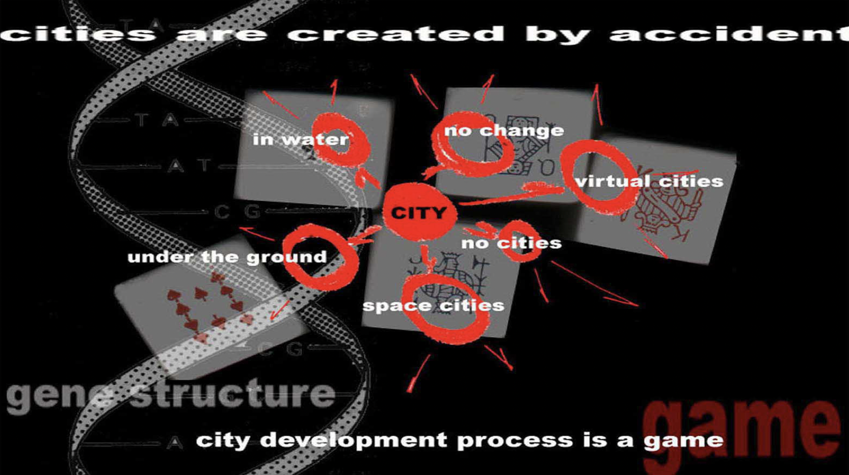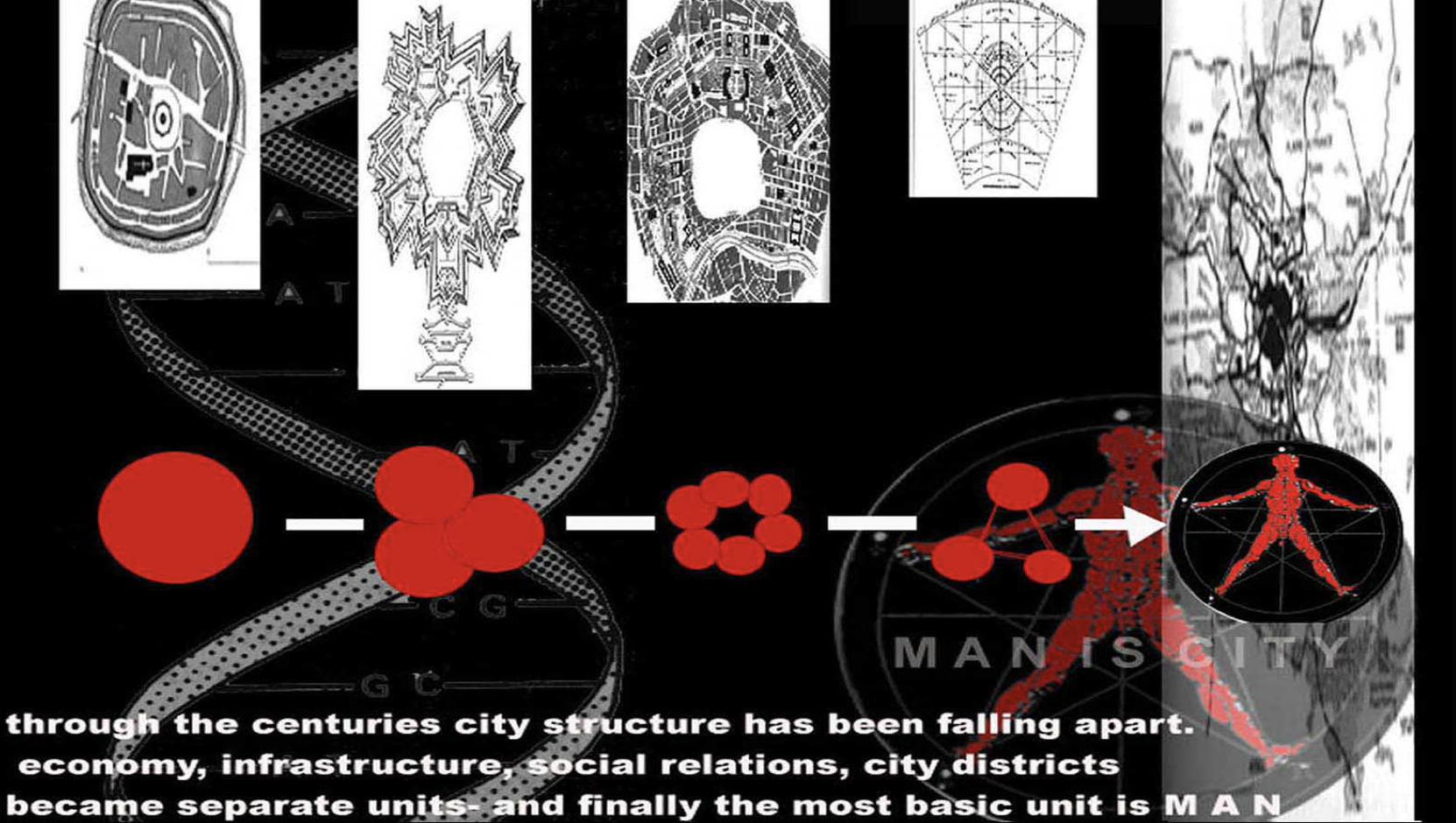 Through centuries city structures had been falling apart. In the era of individualism the economy, infrastructure, social relations and city districts have become separate units, thus the most basic unit of this system is the MAN. City development process is a game, therefore we cannot predict the direction it will evolve into. While being aware of the influence of new technologies we can only work on the development of our own selves – humans. The MAN is the CITY. The project was displayed during the Venice Biennale of Architecture 2000, Venetian Pavilion. As the Polish Pavilion was closed for Architecture Biennale (opened 2004), it was the only Polish project at the Architecture Biennale for years.